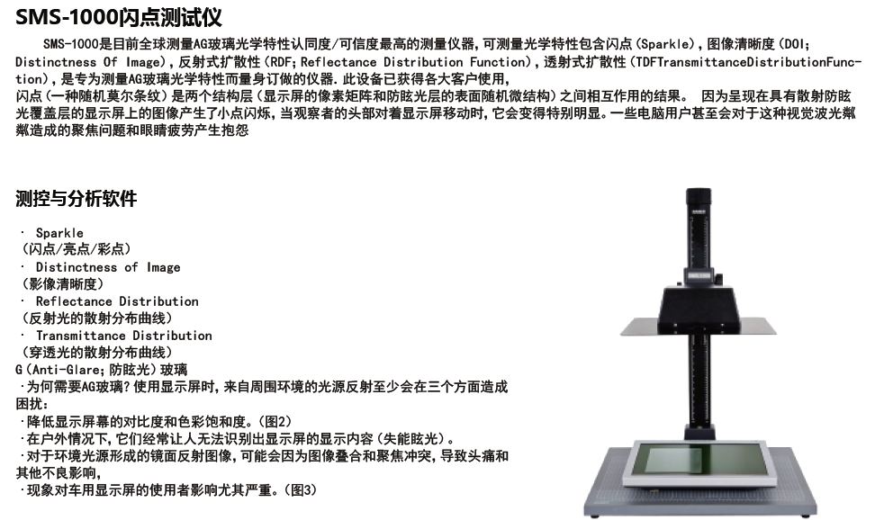 是目前測(cè)量AG玻璃光學(xué)特性認(rèn)同度/可信度hen高的測(cè)量?jī)x器,可測(cè)量光學(xué)特性包含閃點(diǎn),圖像清晰度,反射式擴(kuò)散性,透射式擴(kuò)散性,是專(zhuān)為測(cè)量AG玻璃光學(xué)特性而量身訂做的儀器。